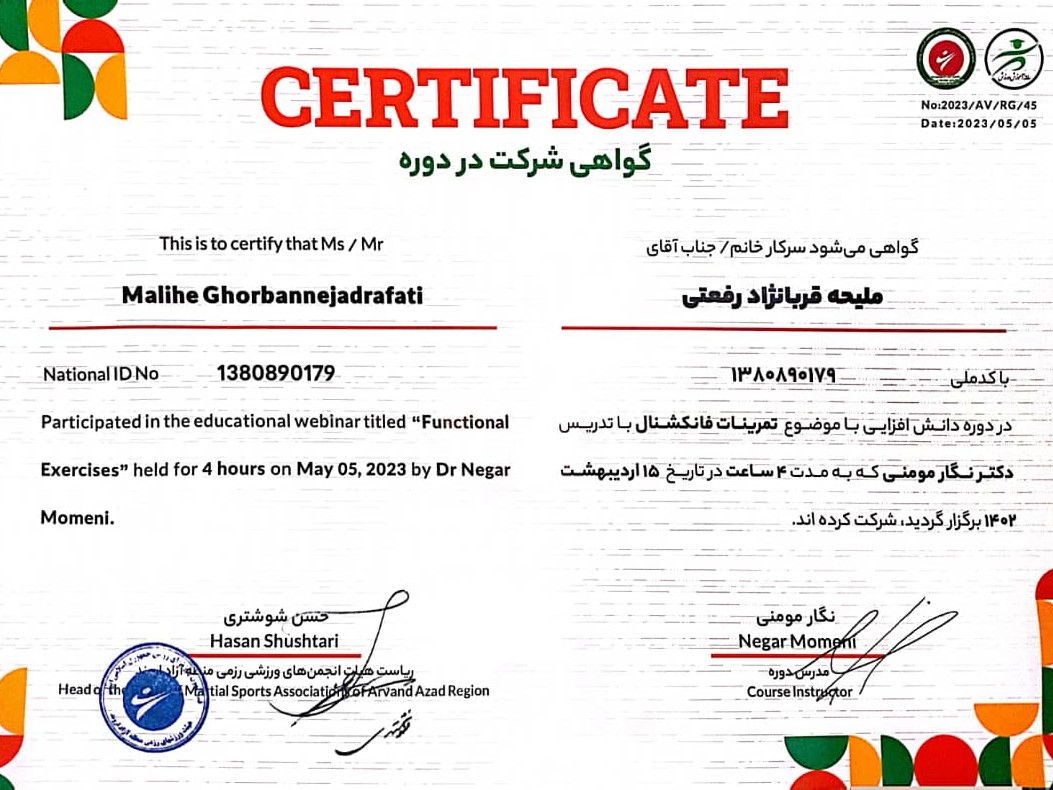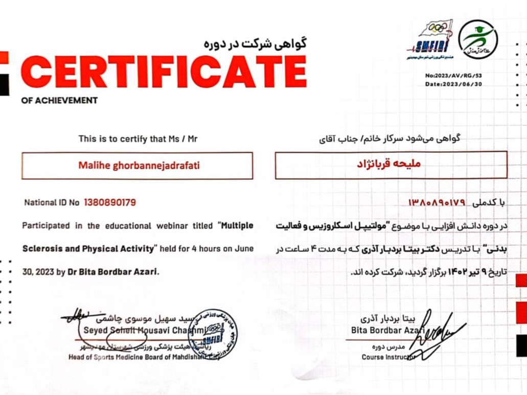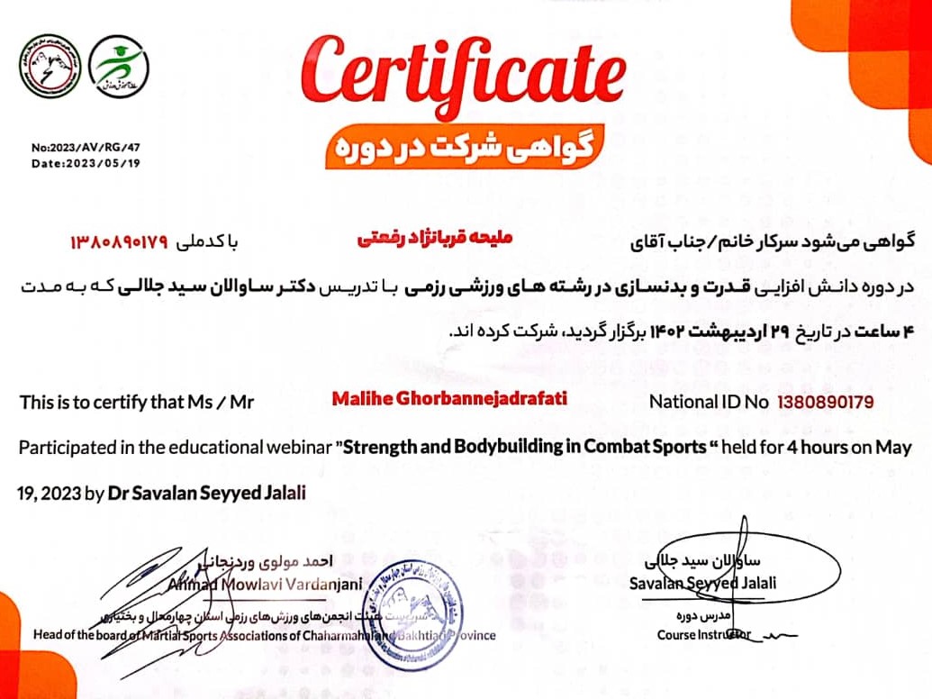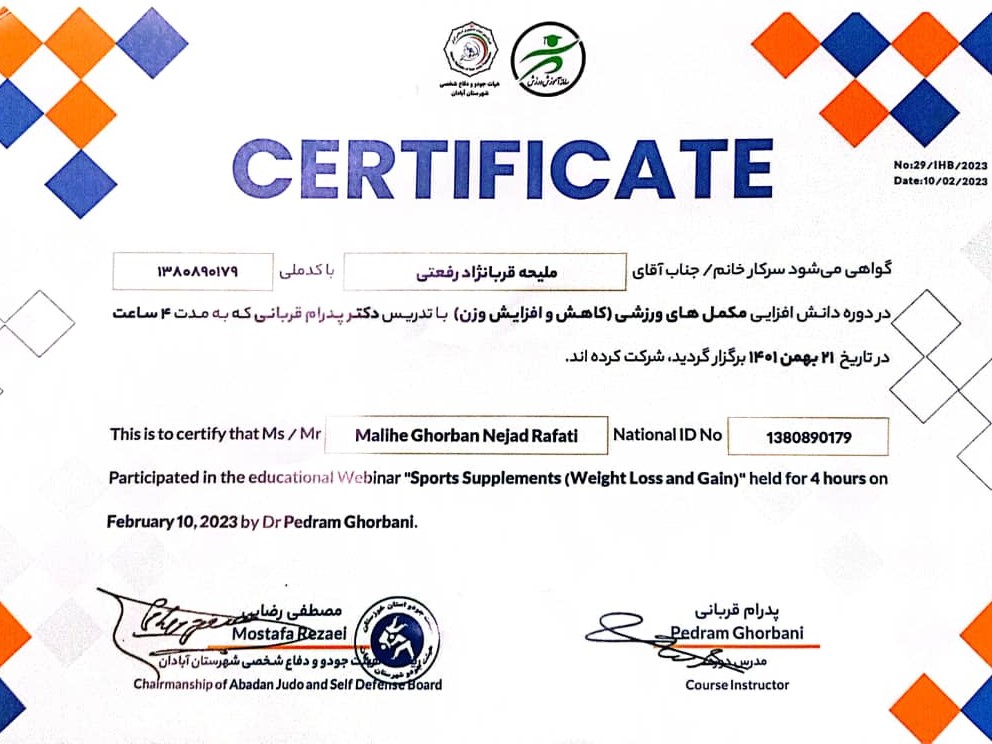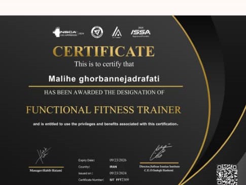 دارای 12 مدرک مربی گری بینالمللی شامل علم تغذیه طراحی تمرین حرکات اصلاحی فیزیک کلاسیک بادی بلدینگ