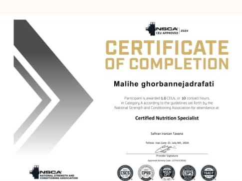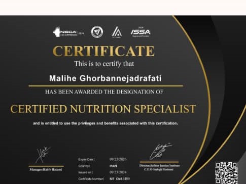 دارای مدرک کارشناسی تغذیه و رژیم ورزشی از سازمانIssA